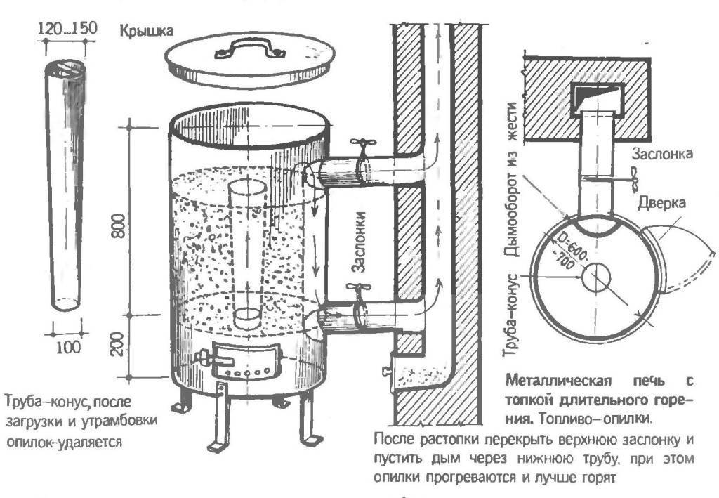 Зная принцип функционирования печи и методику обеспечения длительного горения, сконструировать агрегат и собрать его своими руками несложно. На фото и чертежах представлена довольно простая модель. Для корпуса печки можно взять металлическую бочку, трубу расчетного сечения, баллон из-под сжиженного газа, готовый короб или сварить ящик из листового железа – вариантов более чем достаточно.