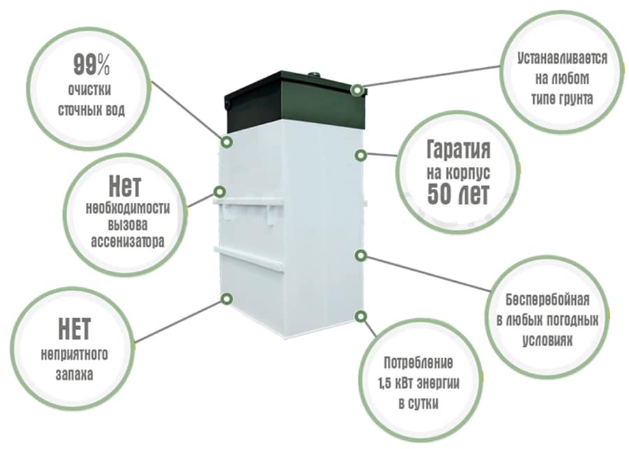 - Обслуживание оборудования можно производить без привлечения ассенизаторов.