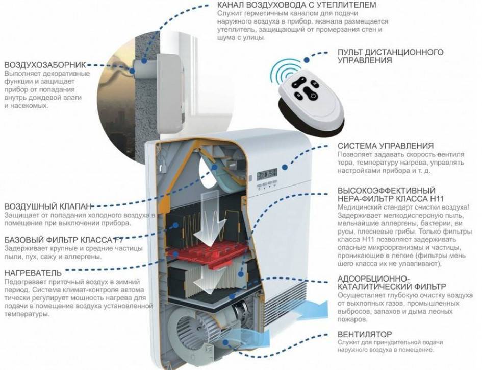 Агрегаты устанавливают в середине канала вентиляции, имеющий круглое или прямоугольное сечение. Воздух, поступающий с улицы, пропускается сквозь систему фильтрации и попадает в калорифер для приточной вентиляции, где происходит его нагрев за счет тепла, который отдает водяная отопительная система, поступающая к теплообменнику через канал воздухонагревателя.