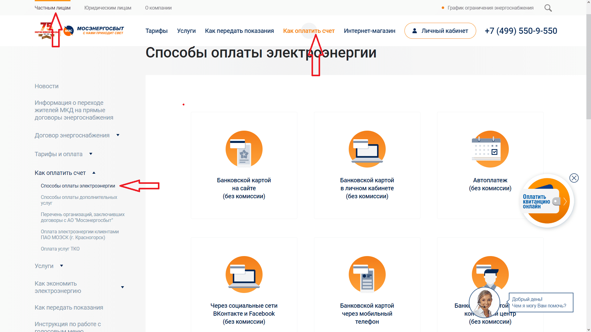 Физическим лицам Мосэнергосбыт предлагает оплатить электроэнергию со счета банковской карты, эмитированной в рублях РФ, позвонив в Контактный центр по номеру телефона +7 (499) 550 95 50.