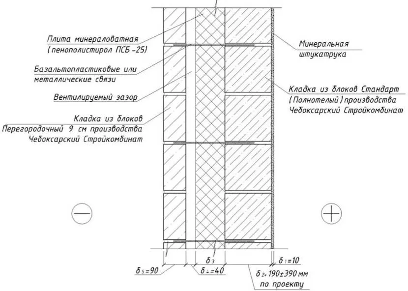 Блоки — неприглядный вариант и внешнюю стену оставляют без отделки редко. Кладку внешнего слоя из отделочного кирпича можно совместить с утеплением. В этом случае теплоизоляцию укладывают между несущей и декоративной частью кладки.