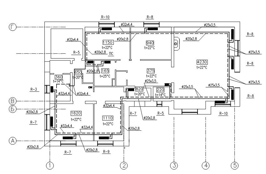 данном случае трубы прокладываются по площади пола. Их количество определяется отдельно