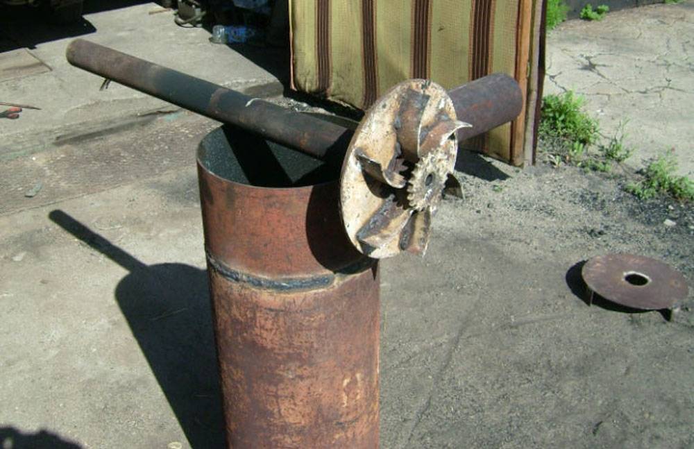 На следующем этапе изготавливается поршневой узел. Из листа расчетной толщины вырезается круг. К кругу по центру приваривается труба воздуховода. После этого по центру вырезают отверстие, соответствующее внутреннему диаметру трубы. На нижнюю плоскость монтируются элементы воздушных каналов – уголки, швеллеры, гнутые полосы. Поверх полос устанавливается отбойник с отверстием. Наружный размер отбойника должен немного превышать диаметр воздуховода. В отбойнике просверливают отверстие по центру. К верхнему концу воздуховода прикрепляют регулирующую заслонку. Механизм готов к использованию.