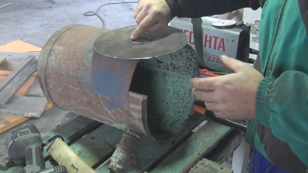 Простейший метод – изготовление печи из баллона или старой толстостенной бочки. По сути топка уже готова. У газового баллона срезается верхняя сферическая часть (болгаркой по существующему стыку). Затем по периметру среза приваривают стальную полосу, которая будет являться юбкой. Диаметр юбки должен быть чуть больше диаметра баллона. В крышке по центру вырезается отверстие, соответствующее наружному размеру трубы воздуховода. Для удобства обслуживания на крышку привариваются ручки из гнутого металла. Крышка готова.