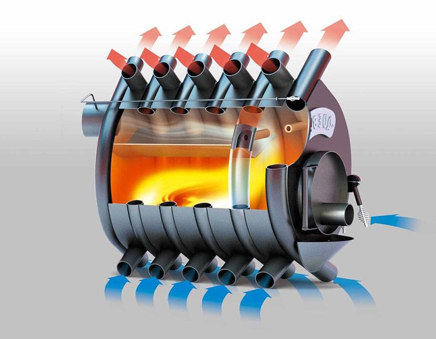 Вокруг кожуха, камеры сгорания, расположены ряды труб. Если в печи используется водяной контур, то в них циркулирует водяной пар. Есть и другие варианты таких печей, в которых по ним для обогрева дома циркулирует воздух.