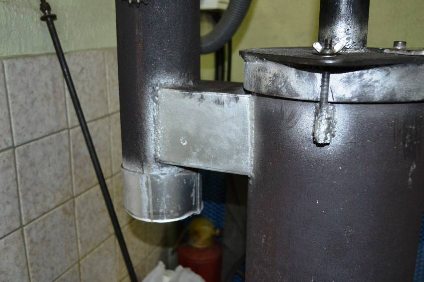 - Привариваем в верхнем резервуаре перегородку-отбойник (ближе к отверстию для горелки). Присоединяем выхлопной патрубок. К нему впоследствии будем подключать дымовую трубу.