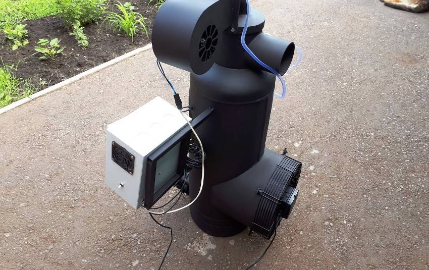 Другим вариантом повышения эффективной работы печи является использование воздушного теплообменника, который представлен вентилятором. В аппарат не вносятся конструктивные изменения, а обогрев помещения улучшается. Вентилятор располагается возле верхней камеры. При ее охлаждении нагретый воздух распространяется по площади помещения. Можно также прогонять воздух через короб, расположенный сверху печки, или по трубе, которая монтируется в камеру дожигания.
