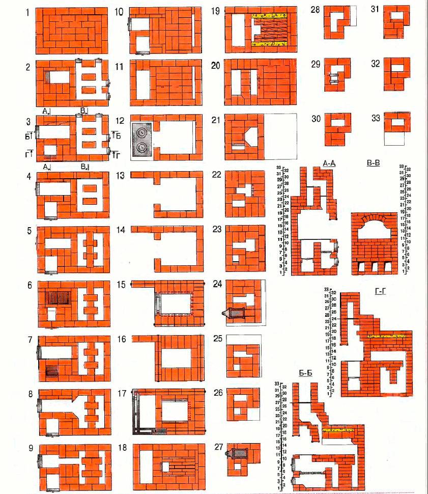В компетентно составленных рабочих чертежах русская порядовка с лежанкой и плитой представлена каждым уровнем по отдельности. Иначе сложить печку будет невозможно из-за сложности ее внутреннего (не видимого снаружи) устройства.