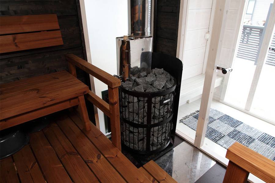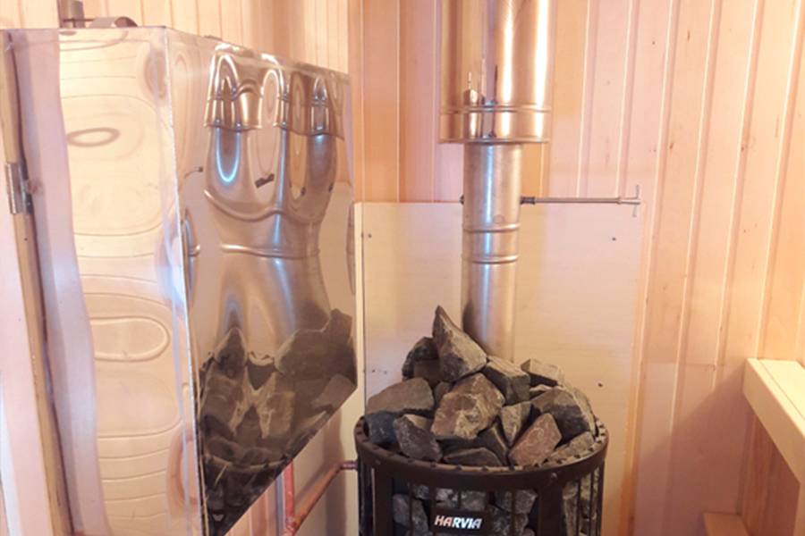 - дымоход — система удаления дыма, которая выводит продукты горения и угарный газ. В финских банях труба проложена под каменкой, что дополнительно нагревает камни.