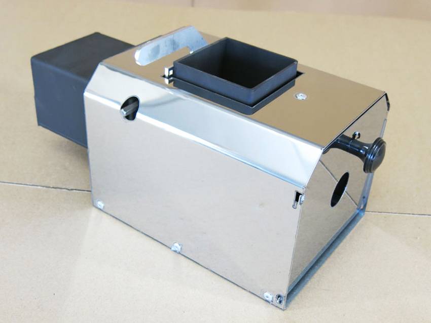 Наружная часть устройства состоит из шнекового конвейера с верхним входным патрубком, через который внутрь попадает топливо из бункера. Второй элемент – это вентилятор, установленный под шнеком и подающий воздух в нижнюю часть камеры.