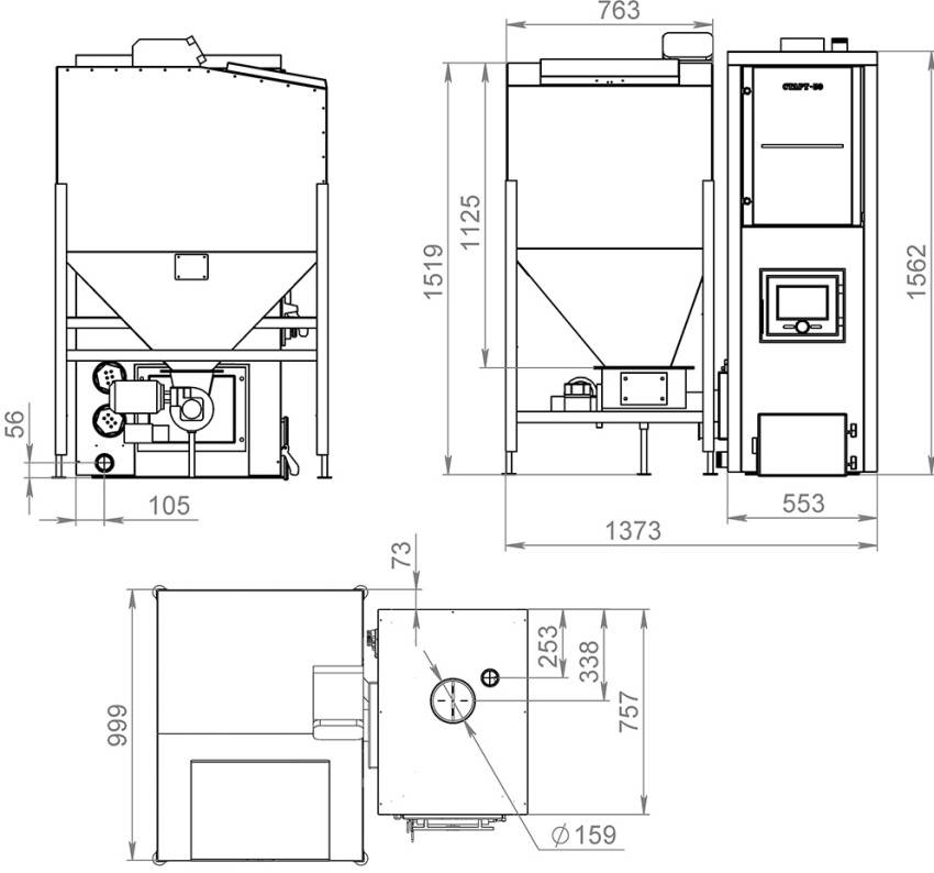 Топочный отдел. Представлен камерой, в которой происходит горение твердотопливных гранул. Оснащается факельной или реторной газовой горелкой и имеет две дверцы (смотровую и очистную).