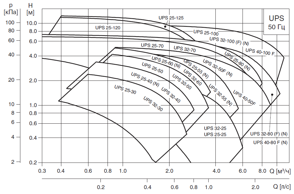 Технические характеристики насос grundfos UPS представлены в каталоге в разделе документация. Ниже мы предлагаем рассмотреть сводное поле гидравлических характеристик.