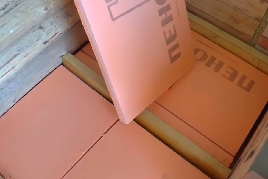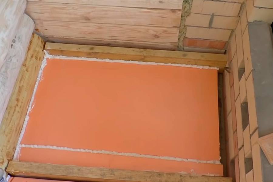 Укладка теплоизоляции производится между вертикальными планками, уложенными на ребро. Они выполняют роль лаг для чистового пола и одновременно служат бортиками для отсеков с теплоизоляцией. Плиты пеноплекса укладывают плотно друг к другу, стыки проклеивают алюминиевым скотчем или заполняют монтажной пеной.