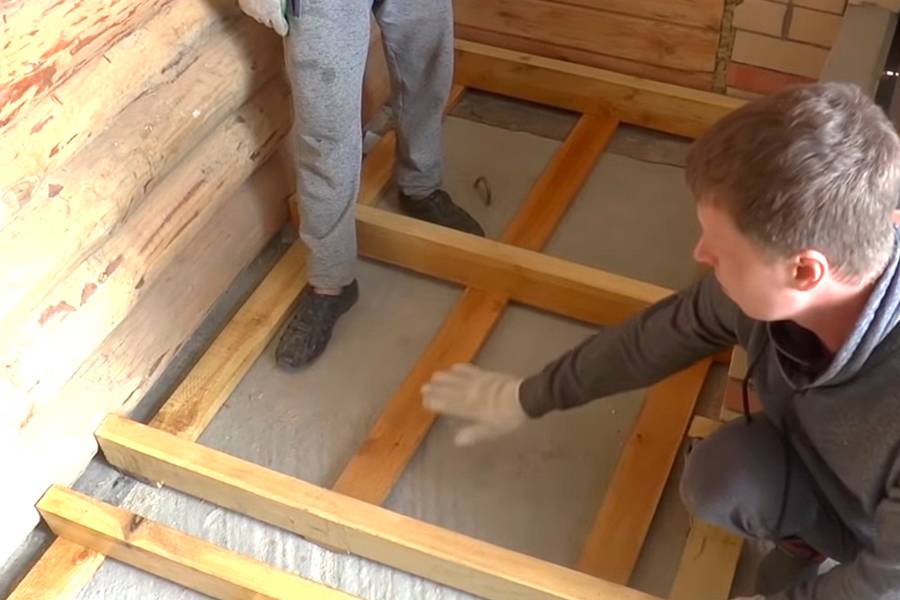 - Лаги обрабатываются средством от плесени и гнили. Вдоль всей длины прибиваются бруски, на которые укладывается черновой пол.