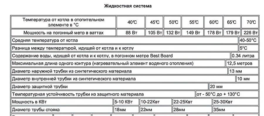 Таблица зависимости мощности теплого плинтуса от дельты температур (теплового напора)
