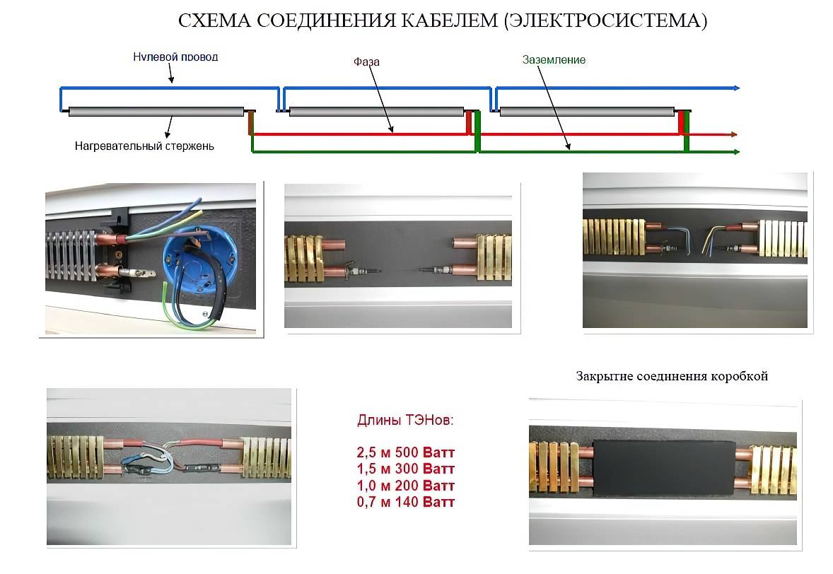 В электрические плинтуса вставляют специальные низкотемпературные ТЭНы. Они нагреваются максимум до 60 oC. При этом мощности их более чем достаточно: один погонный метр выдает около 180-280 Вт. Электрические нагреватели вставляют в нижнюю трубку, а в верхнюю укладывают кабель в специальной оболочке. С его помощью подается напряжение на все участки ТЭНа. Длина одного от 70 см до 2,5 м, и из разной длины нагревателей набирается необходимая для обогрева помещения мощность.