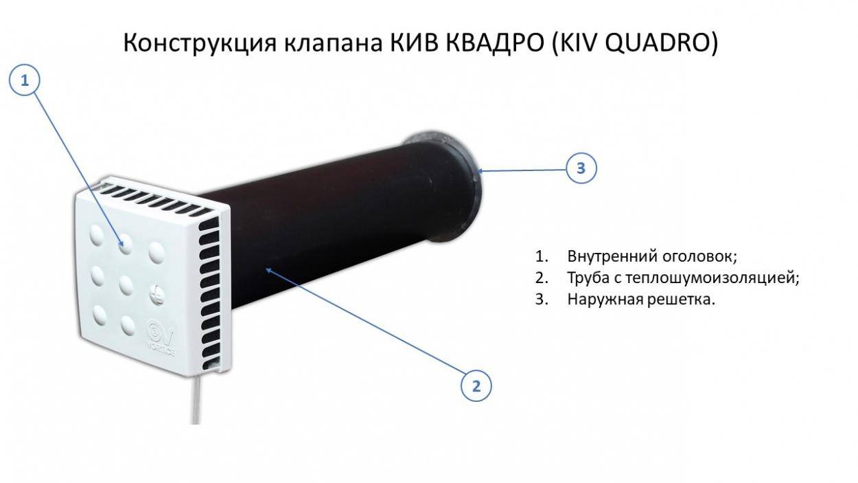 KIV QUADRO представляет собой пластиковую трубу наружным диаметром 133 мм и длиной до 1м, которая вставляется в заранее подготовленное отверстие в наружной стене здания, подрезается по толщине стены и с уличной стороны закрывается литой алюминиевой решеткой с антимоскитной сеткой. В трубе приточного клапана располагается теплошумоизоляция. Внутри помещения ставится белый пластиковый оголовок с фильтром и заслонкой. Можно сказать, что приточный клапан КИВ КВАДРО представляет собой модернизированную форточку. Наружная решетка приточного клапана с сеткой задерживает листву, тополиный пух, насекомых и не позволяет осадкам попадать внутрь трубы.