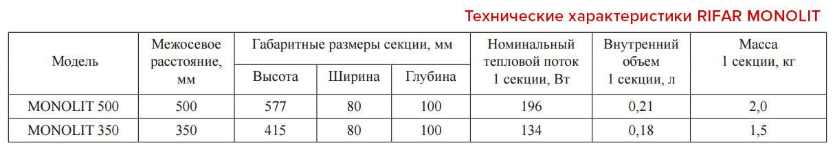 | Серия Rifar | Расстояние между осями (мм) | Размеры: высота, ширина, глубина (мм) | Мощность одной секции (Вт/час) | Допустимая температура (°С) | Цена одной секции (руб.) |