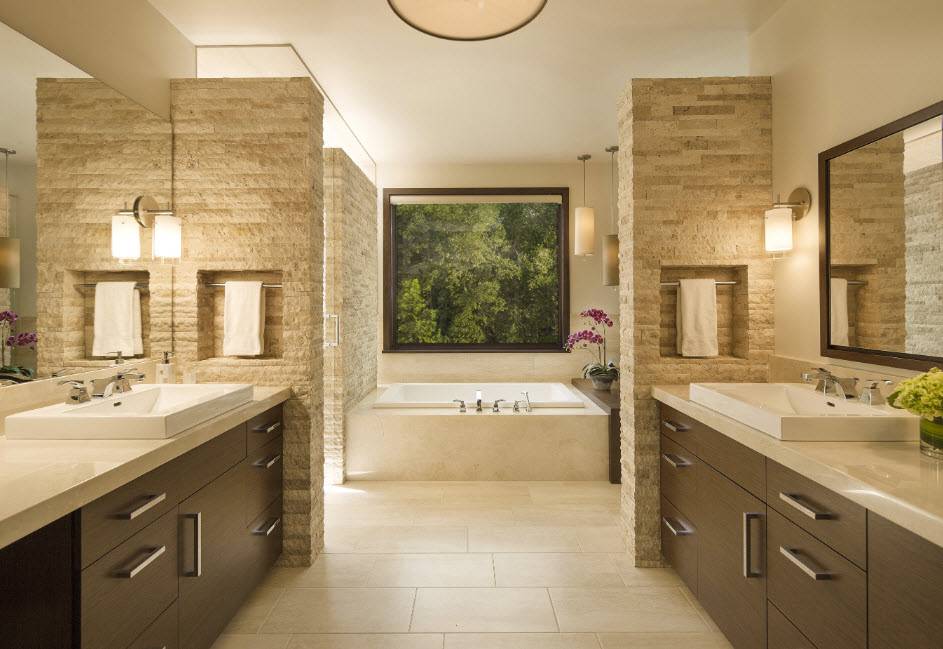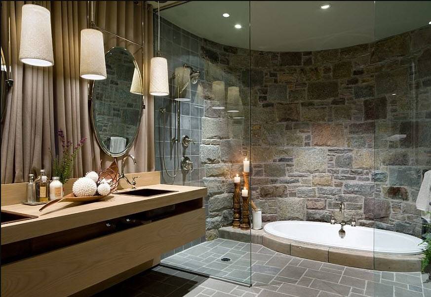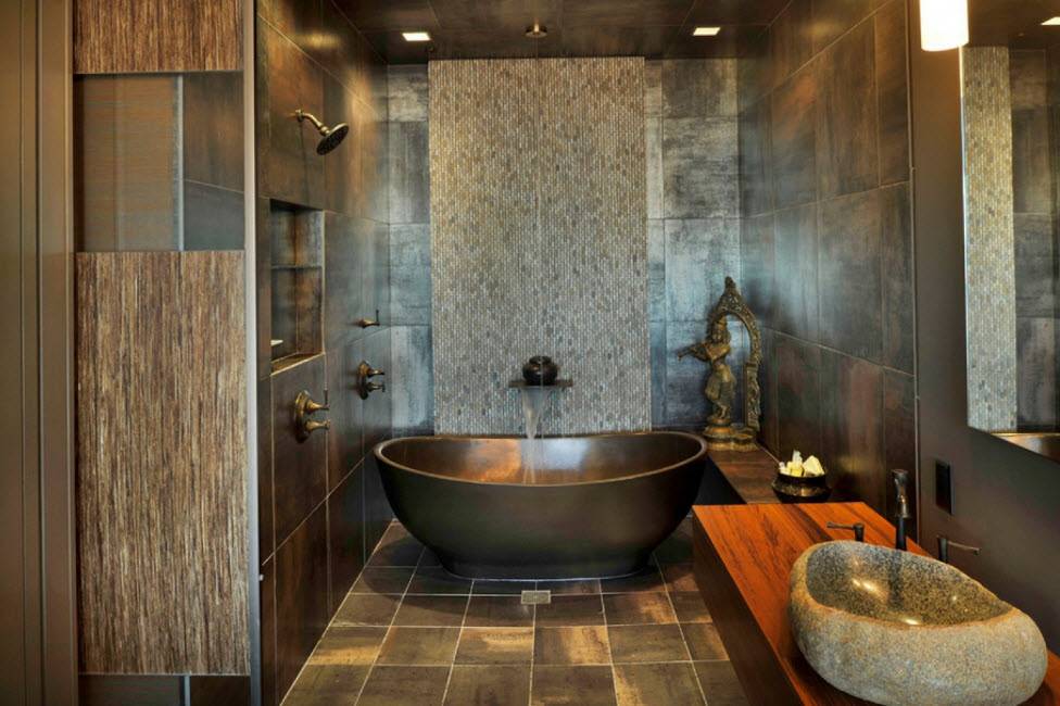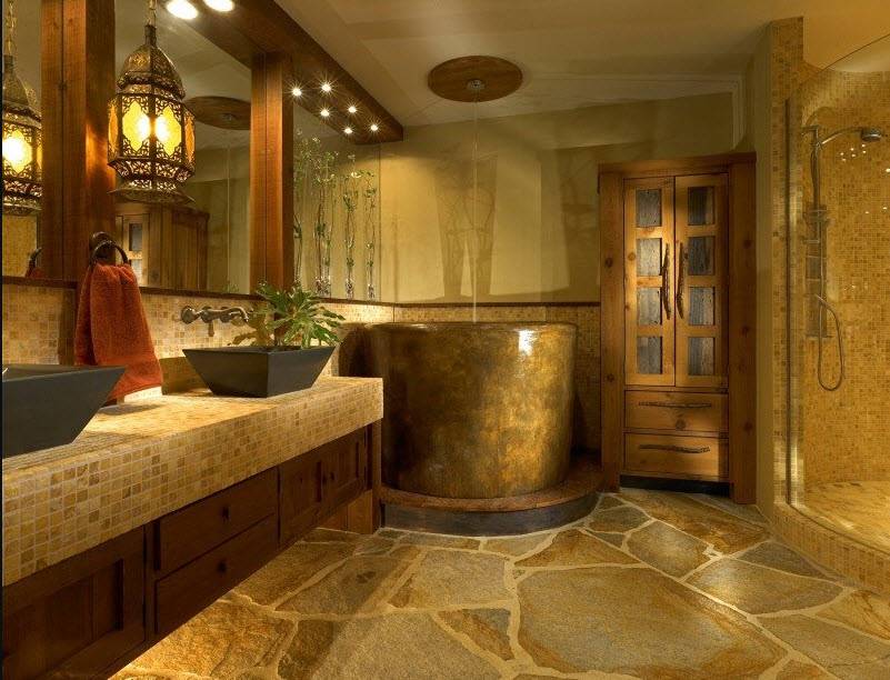 Для интерьера в восточном стиле характерны покой и умиротворенность. Для оформления стен и пола используют натуральный камень. Плитку выбирают в бежево-коричневых тонах. Простота и минимализм – основные черты интерьерного решения.