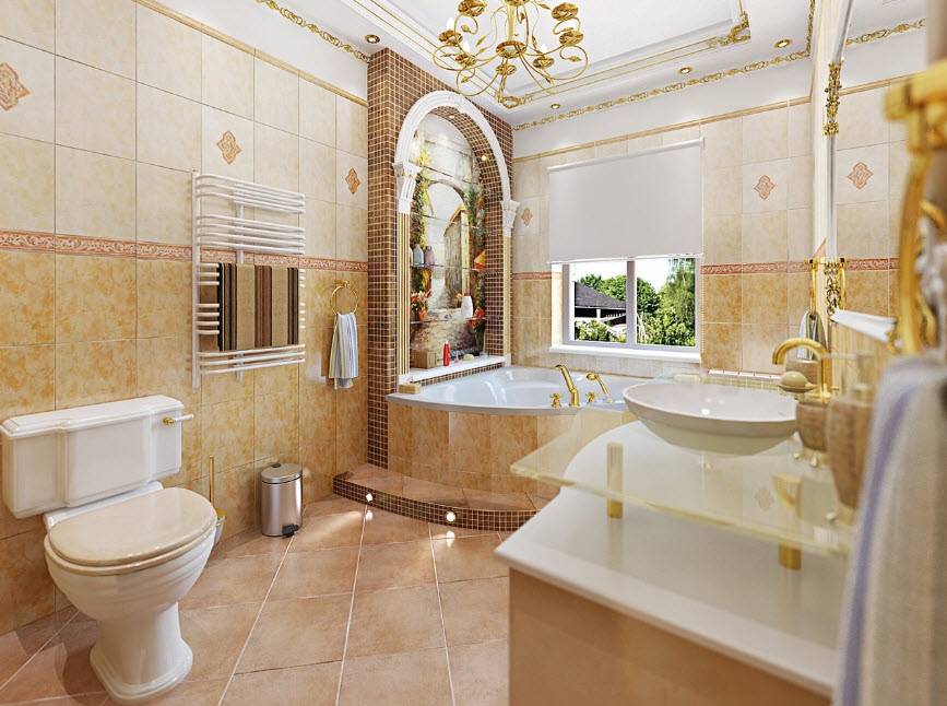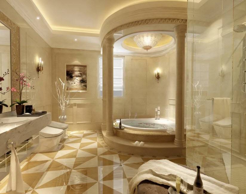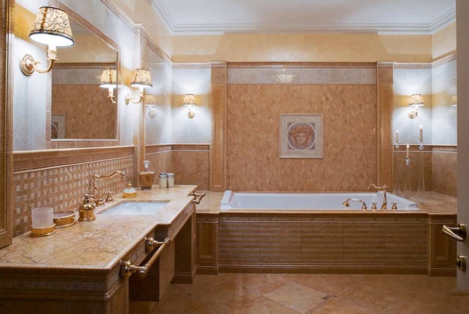 Классический стиль интерьера ванной будет популярным всегда. Для его оформления используют плитку из мрамора. Отделочные материалы для классического интерьера являются качественными и дорогостоящими. Удачным цветовым решением считается выбор спокойных, умиротворяющих оттенков, которые будут хорошо сочетаться с мебелью из дорогих пород дерева.