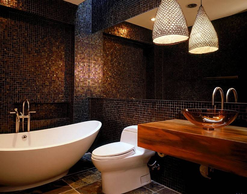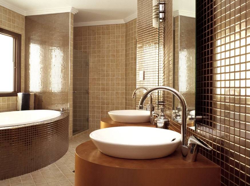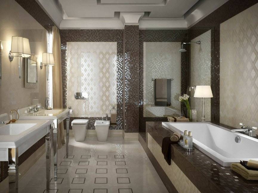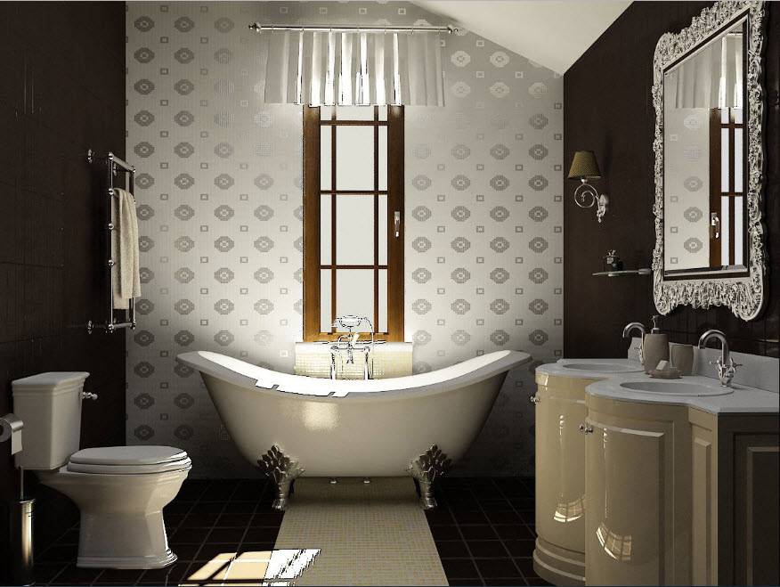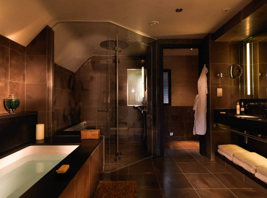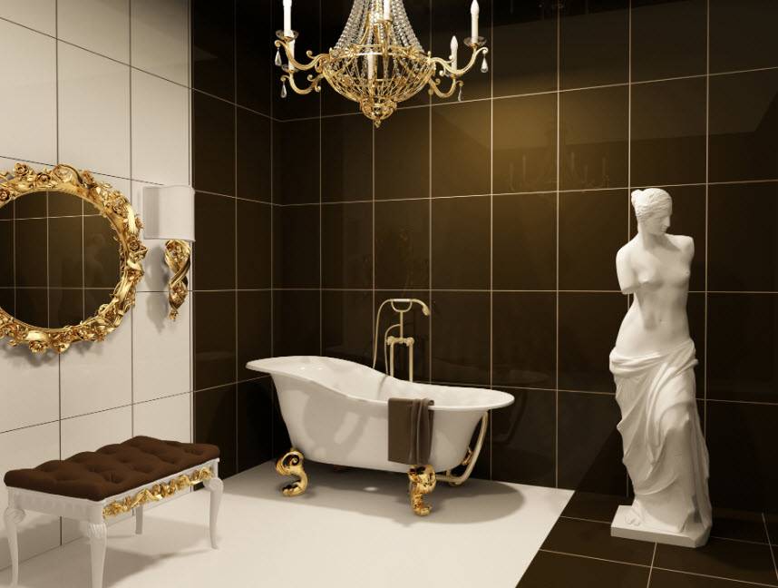 Очень красиво смотрится сочетание насыщенного цвета темного шоколада и теплого бежевого оттенка. Чтобы создать такой интерьер, ванну можно поместить в короб, выложенный кафелем под цвет шоколада, таким же материалом оформить и область душа. Свободные поверхности окрасить в бежевый цвет и повесить на них картины.
