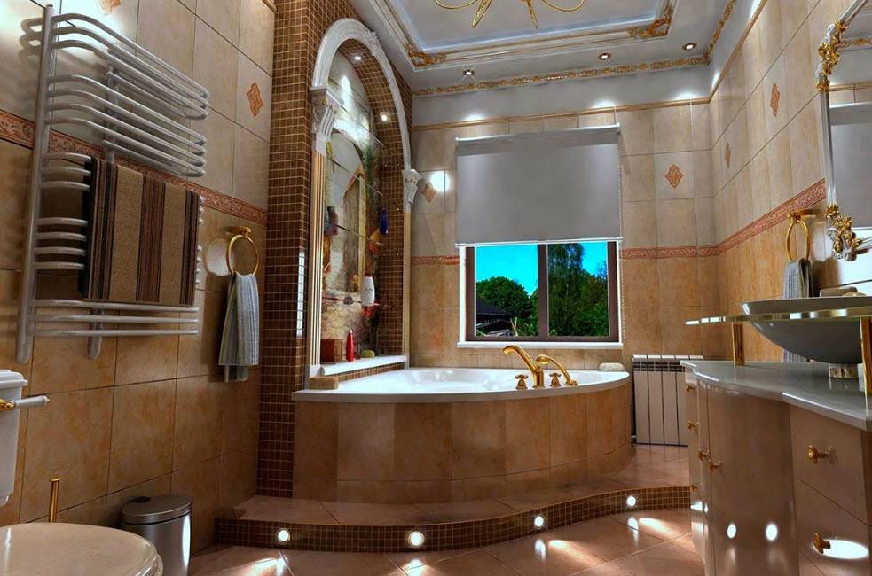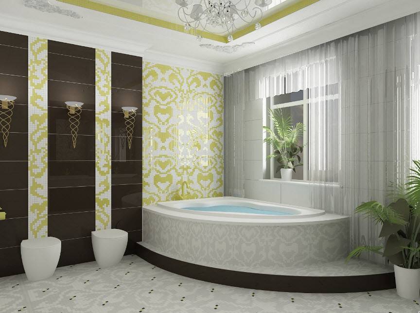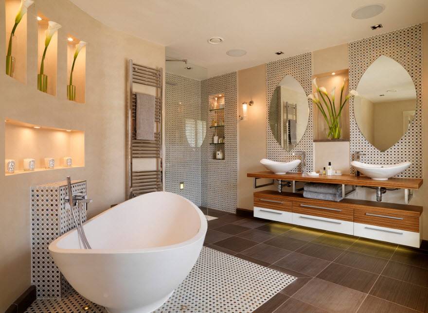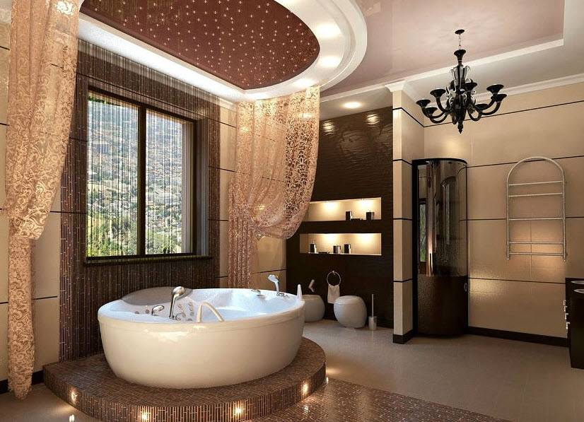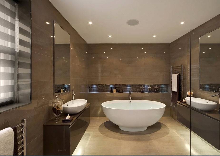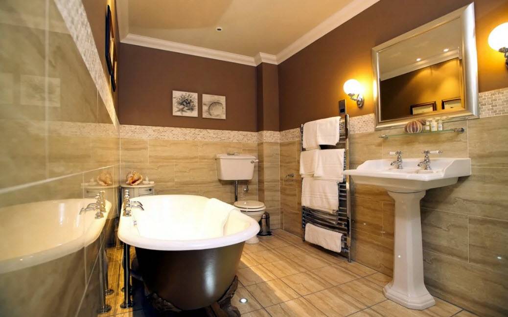 Очень красиво смотрится сочетание насыщенного цвета темного шоколада и теплого бежевого оттенка. Чтобы создать такой интерьер, ванну можно поместить в короб, выложенный кафелем под цвет шоколада, таким же материалом оформить и область душа. Свободные поверхности окрасить в бежевый цвет и повесить на них картины.