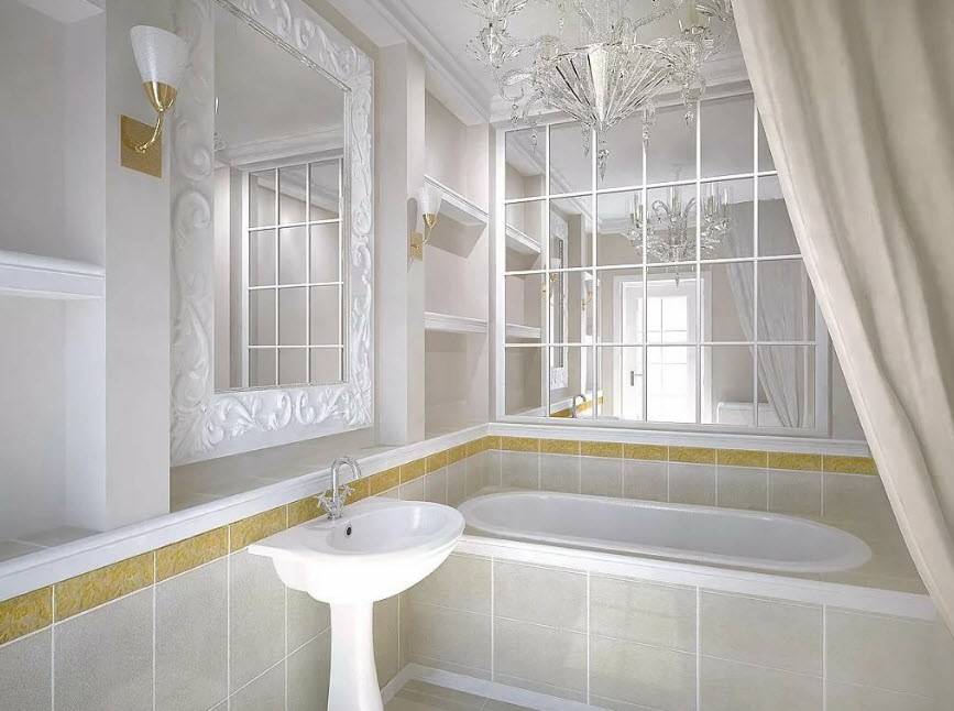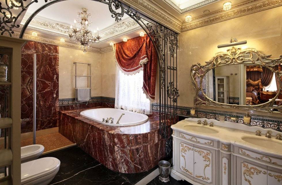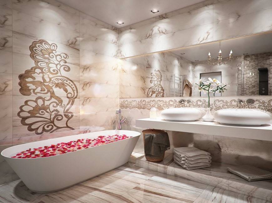 Ванная в стиле барокко способна стать изюминкой всего дома. Плитка для такого помещения выбирается в сдержанных пастельных тонах. Укладывают плитку в классическом варианте. Роскошь интерьеру придадут изысканные аксессуары.