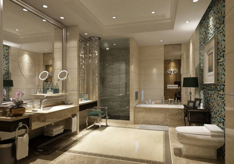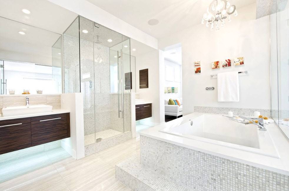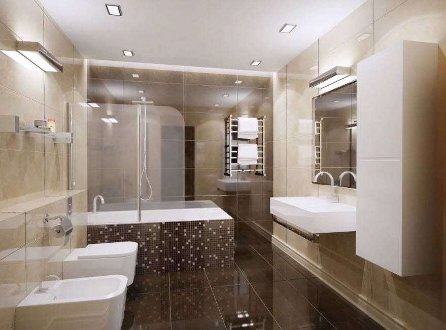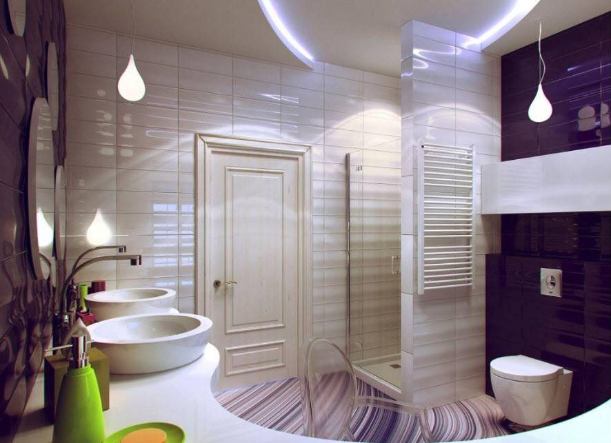 Превосходно будет смотреться глянцевая плитка, которая способна визуально сделать пространство глубоким и расширить его. Ей можно выложить поверхность, вдоль которой установить душевую и ванну.
