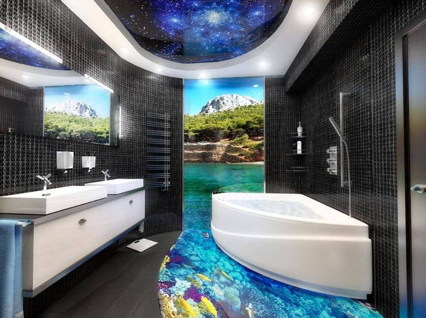 Разнообразие форм, размеров и цветовых гамм позволяют превратить ванную комнату в настоящее произведение искусства. Например, панно на всю стену или захватывающее 3D изображение.