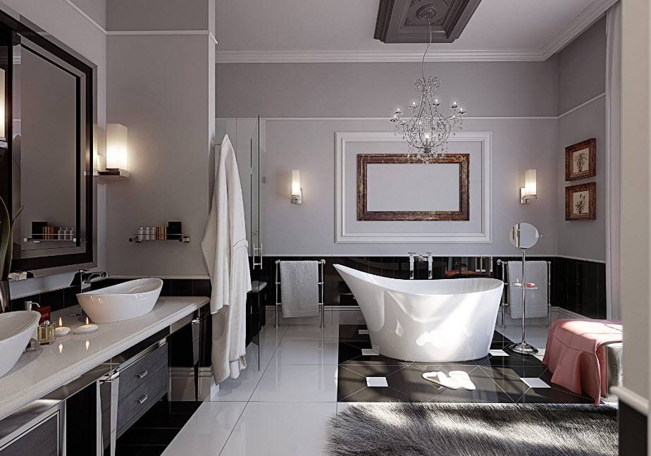 Для оформления ванной в стиле арт деко используют все оттенки серого. Облицовка стен плиткой графитно серого цвета будет красиво сочетаться с черным полом. Крупный растительный орнамент на плитке подчеркнет элегантность помещения. Очень эффектно смотрится плитка с необычным рисунком на полу.