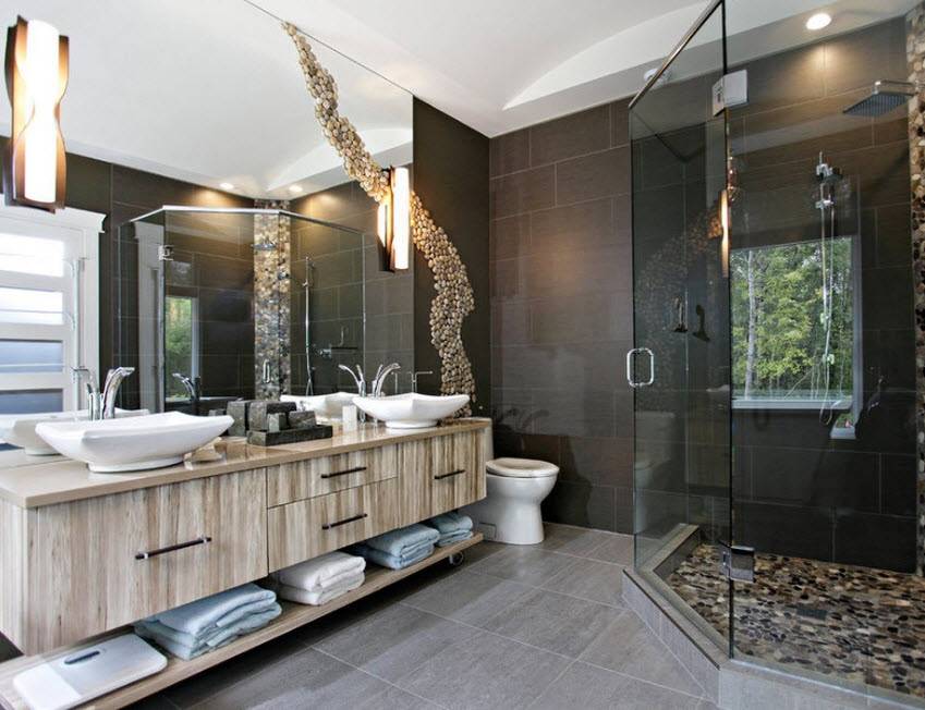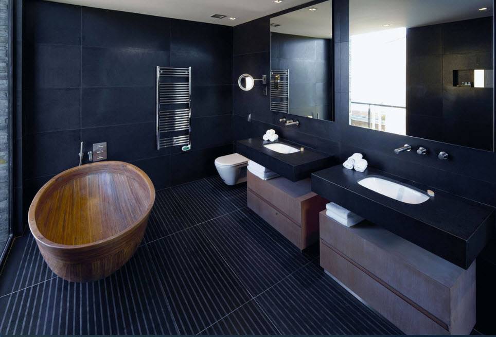 Оригинальным решением для дизайна будет комната с темным кафелем на стенах и полу, и белой сантехникой на их фоне. Для облицовки необходимо будет подобрать крупную плитку с минимальным количеством разводов. Такие поверхности легко моются, а благодаря невыразительному рисунку изделий, на них не будут выделяться разводы и капли от воды.