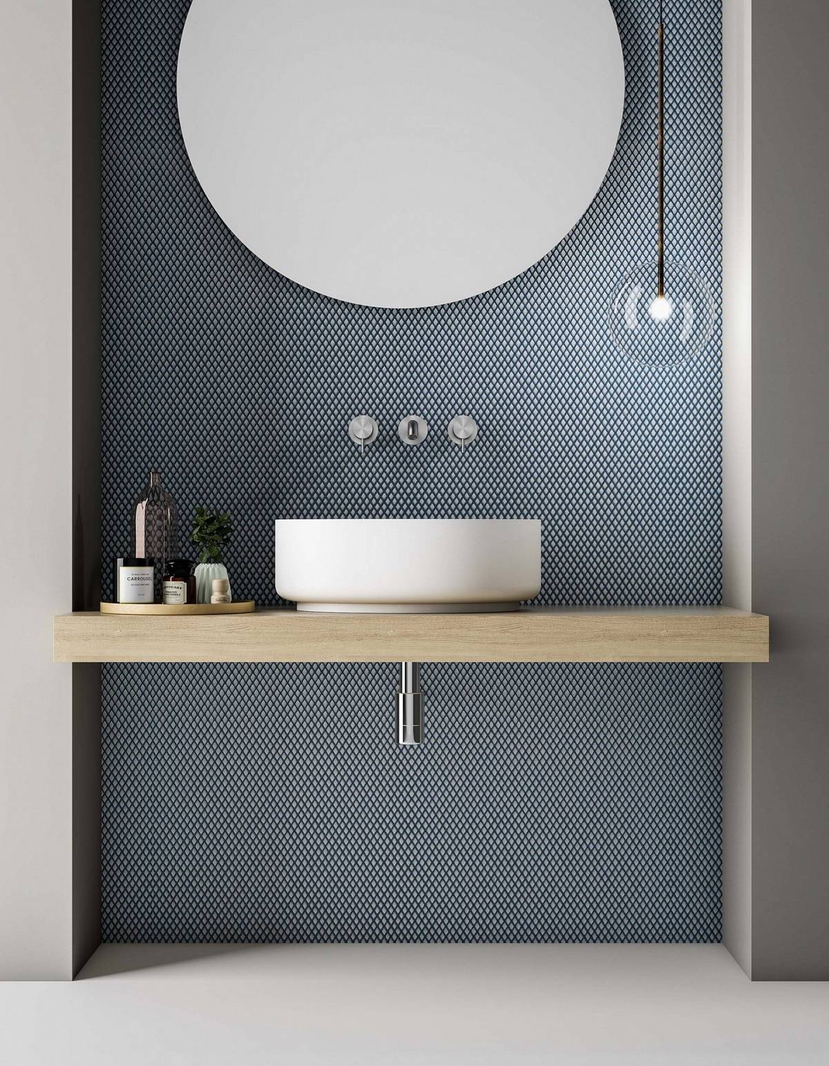 Можно выбрать и другие варианты, но основное условие тренда – плитка должна быть с углами. Ни в коем случае не использовать округлой формы предметы.