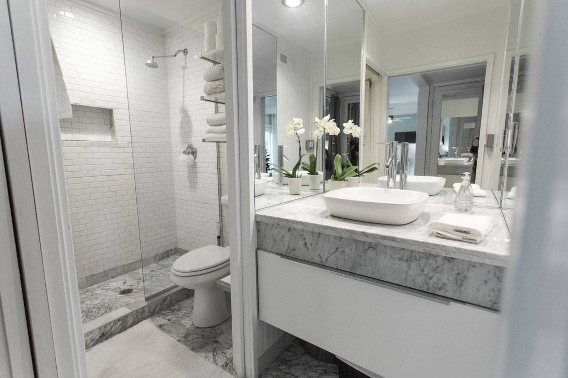 Отличное сочетание зеркал, мрамора и белых поверхностей создаёт ощущение простора и обилия света