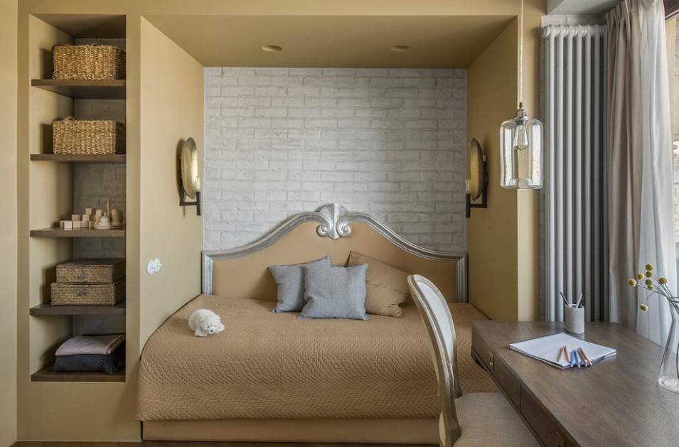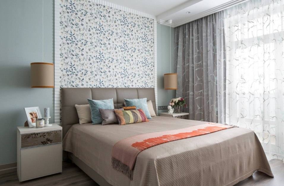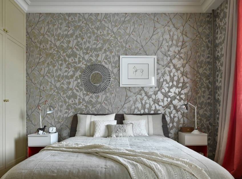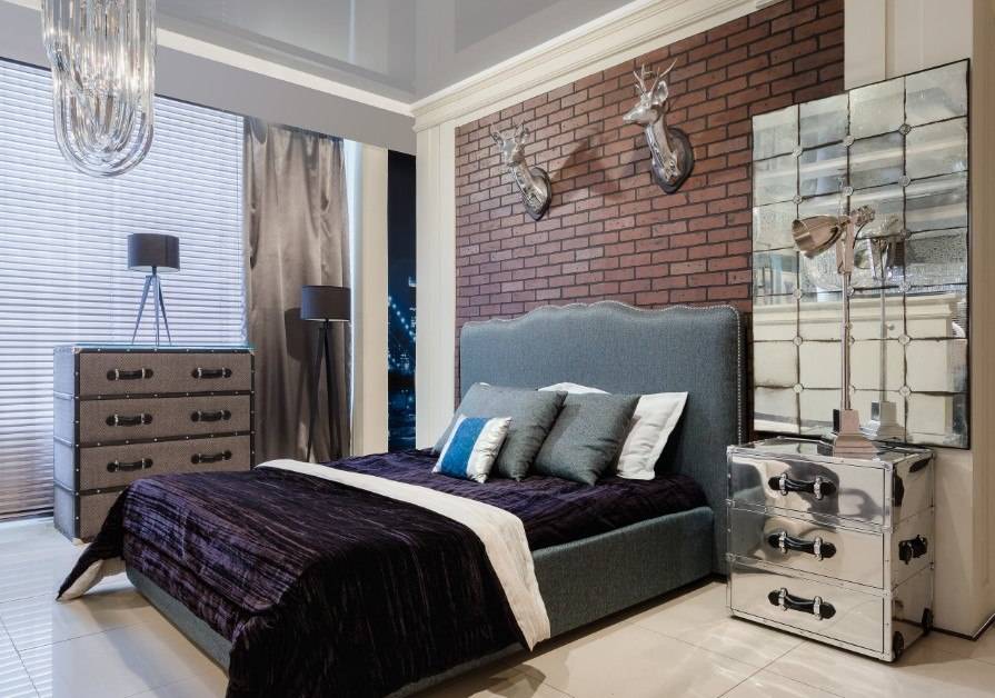 В таком помещении должна присутствовать только необходимая мебель. Современным и подходящим элементом является фитопанно. Выбирают разные облики сухих растений, которые соответствуют тону комнаты. Изголовье и изножье кровати обшивают мягкими тканями. Это не только комфортно, а и эстетично, и роскошно в дизайне. Зеркальные вставки, молдинги яркого цвета, рукодельные панно на стенах придают необычный, эксклюзивный вид.