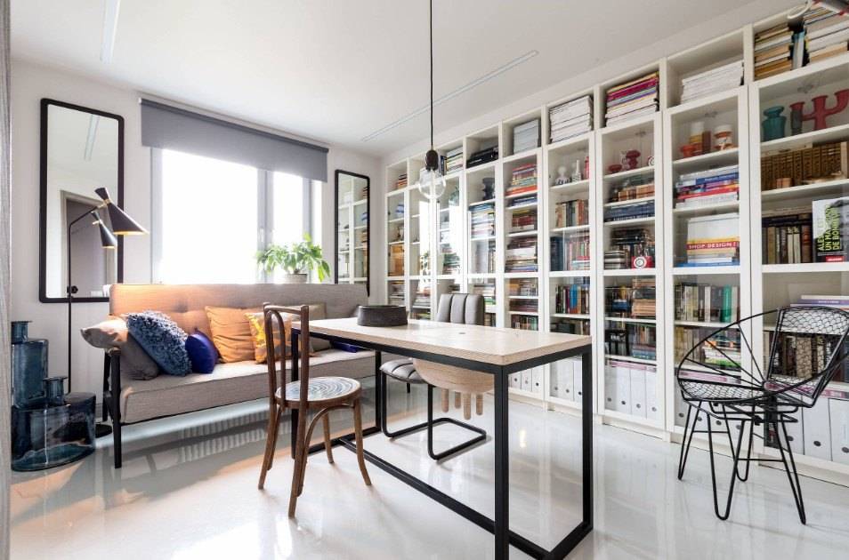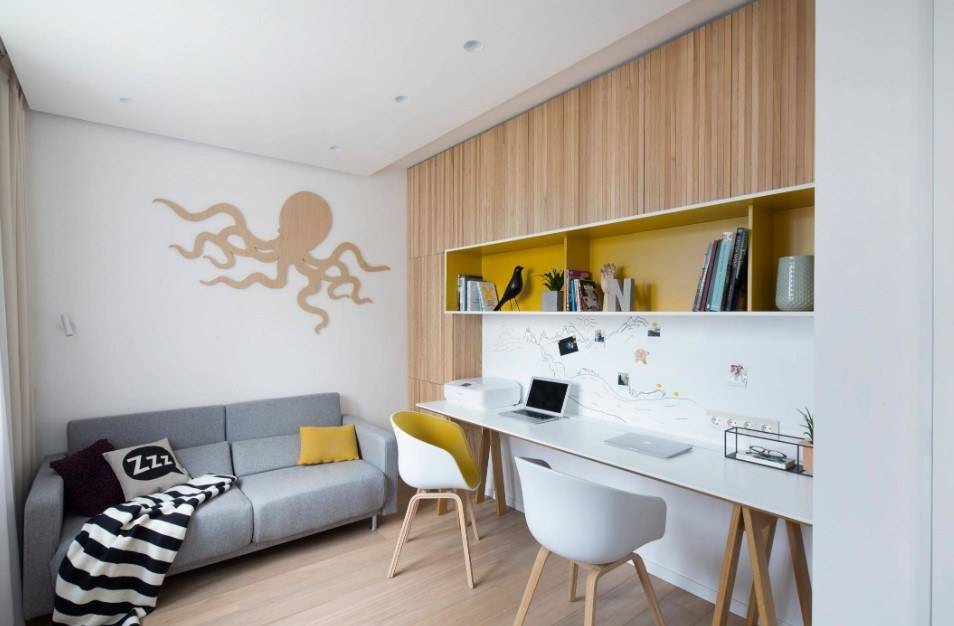 Такой вид отделки стен отлично подходит для зонирования пространства. Этот вариант сейчас особенно популярен в связи с растущим спросом на домашние офисы.
