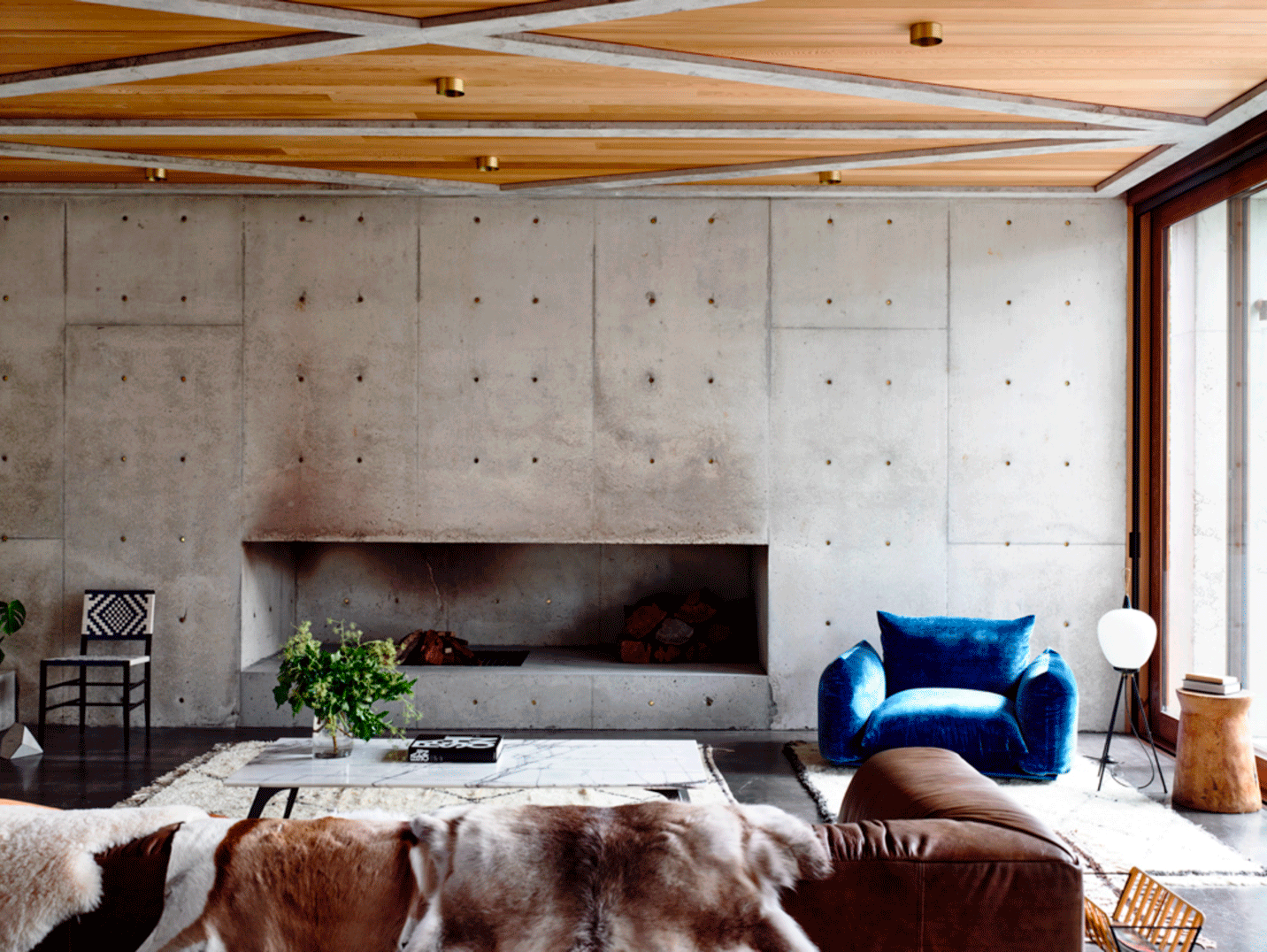 Фактурный плед, меховые подушки, шерстяной ковер дополняют друг друга и «персонализируют» пространство, придают интерьеру уютную и теплую атмосферу. /Фото: i.pinimg.com