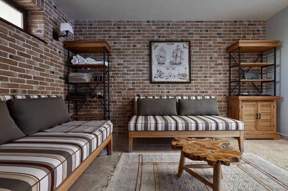 Образно выбирают покрытие с оттенком, который соответствует тону обивки. Общее пространство приобретет законченный, комфортный вид. Каменная кладка также будет актуальной в гостиной.