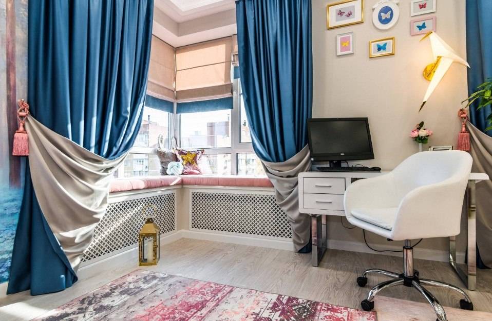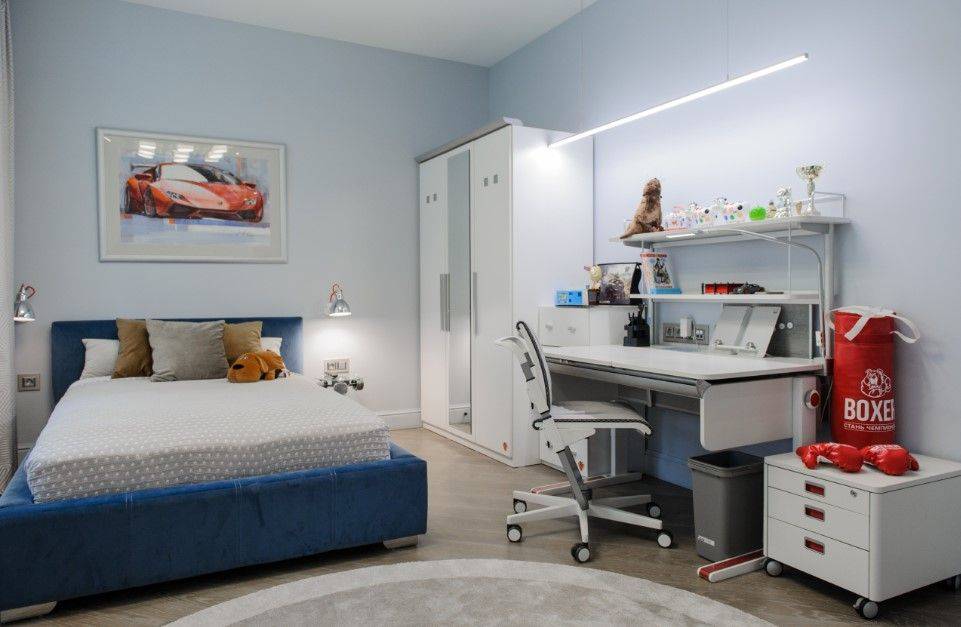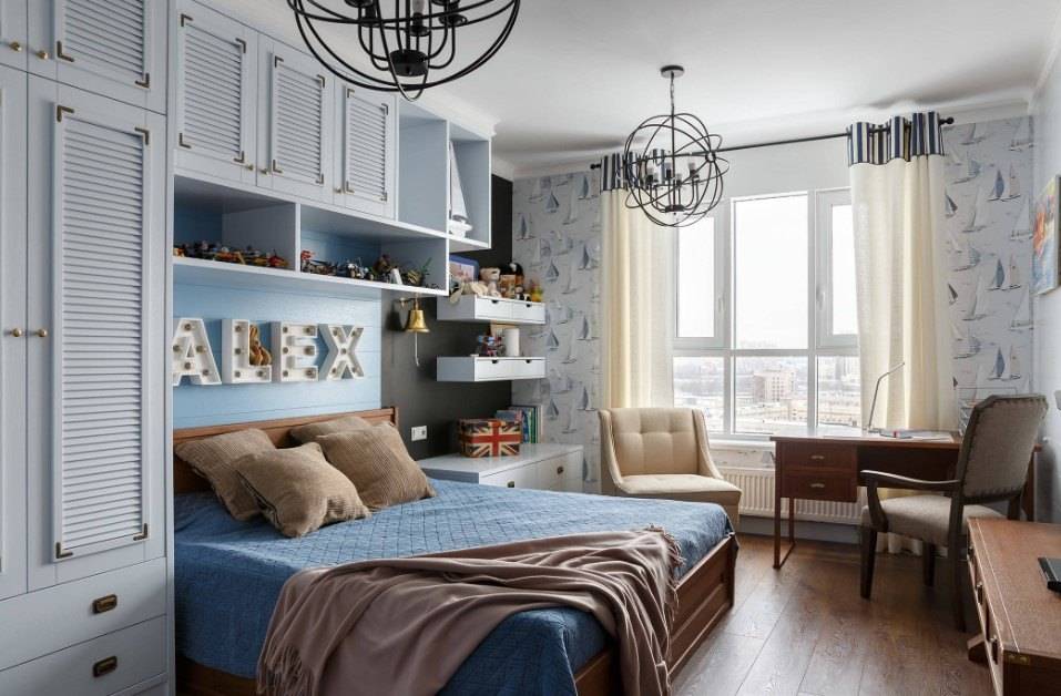 В оформлении этой комнаты рекомендуют использовать синий. При этом выбор сосредотачивают на плавных переходах нескольких красок.