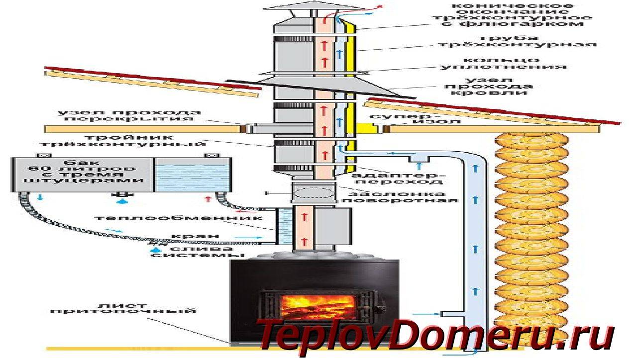 В промышленных условиях для внутреннего слоя сэндвича используют нержавеющие изделия, а для внешнего – трубы из стали с цинковым покрытием. При этом внутренний контур покрывают теплоизоляцией и помещают внутрь внешнего цилиндра. В результате, функционирует такое сооружение довольно эффективно и качественно.