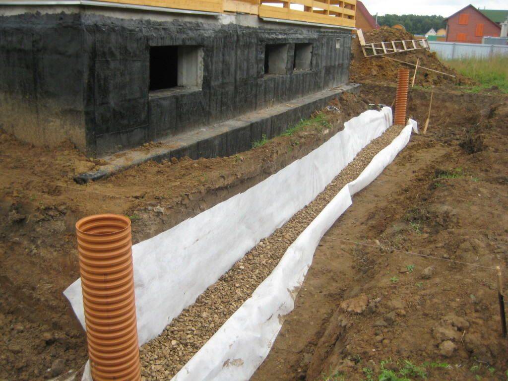- Из накопительного колодца вода может отводиться куда угодно: в технический бассейн, в природный водоём, в централизованную канализацию. Дно траншей, в которых уложены дрены, отсыпается сначала щебнем, а потом песком. Затем делают ложе для труб: застилают геотекстиль, а потом насыпают ещё один слой мытого гравия – на него и укладывают трубы.