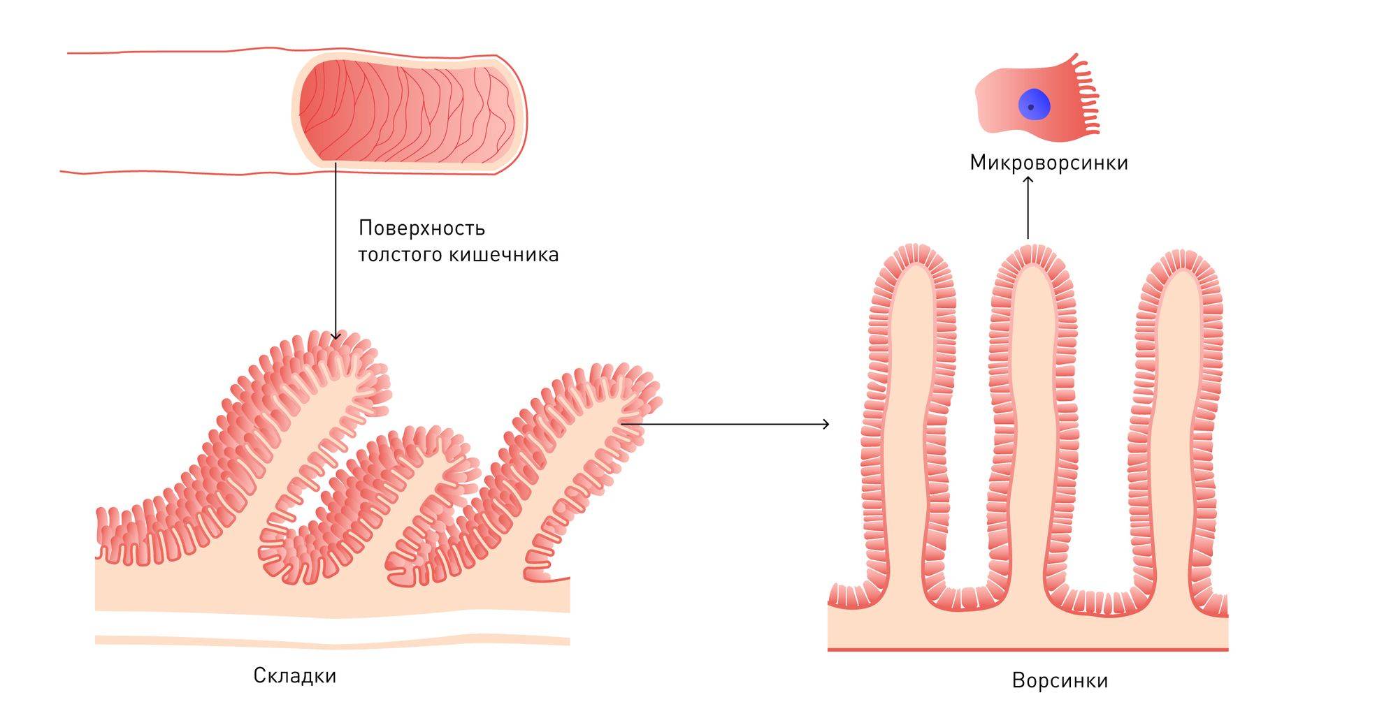 Задача кишечника — впитать максимальное количество полезных веществ, а для этого нужна большая площадь поверхности. Чтобы ее уместить, строение кишечника представляет собой плотно прилегающие друг к другу складки с ворсинками и микроворсинками. Из-за этого кишечник часто сравнивают с бархатной тканью.