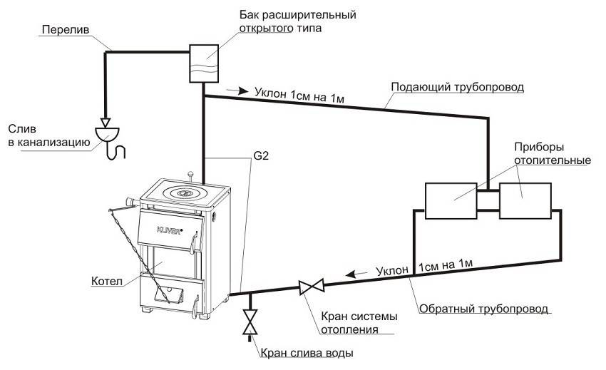 На рис. 1 : 1 — котел; 2 — дымовая труба; 3 — подающая труба (диаметр 40-50 мм); 4 — «обратка» (диаметр 40-50 мм); 5 — труба (1/2); 6 — расширительный бак открытого типа.