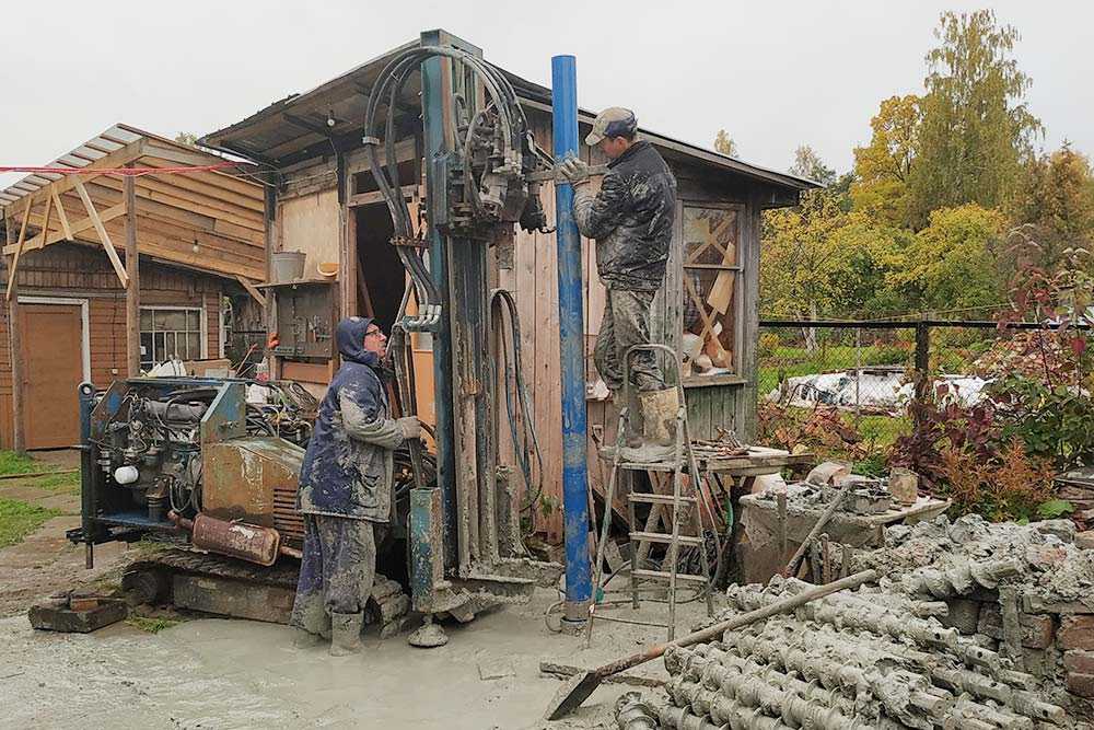 При использовании промышленного бура вначале выполняется «прокол» грунта, потом в него опускаются обсадные трубы.