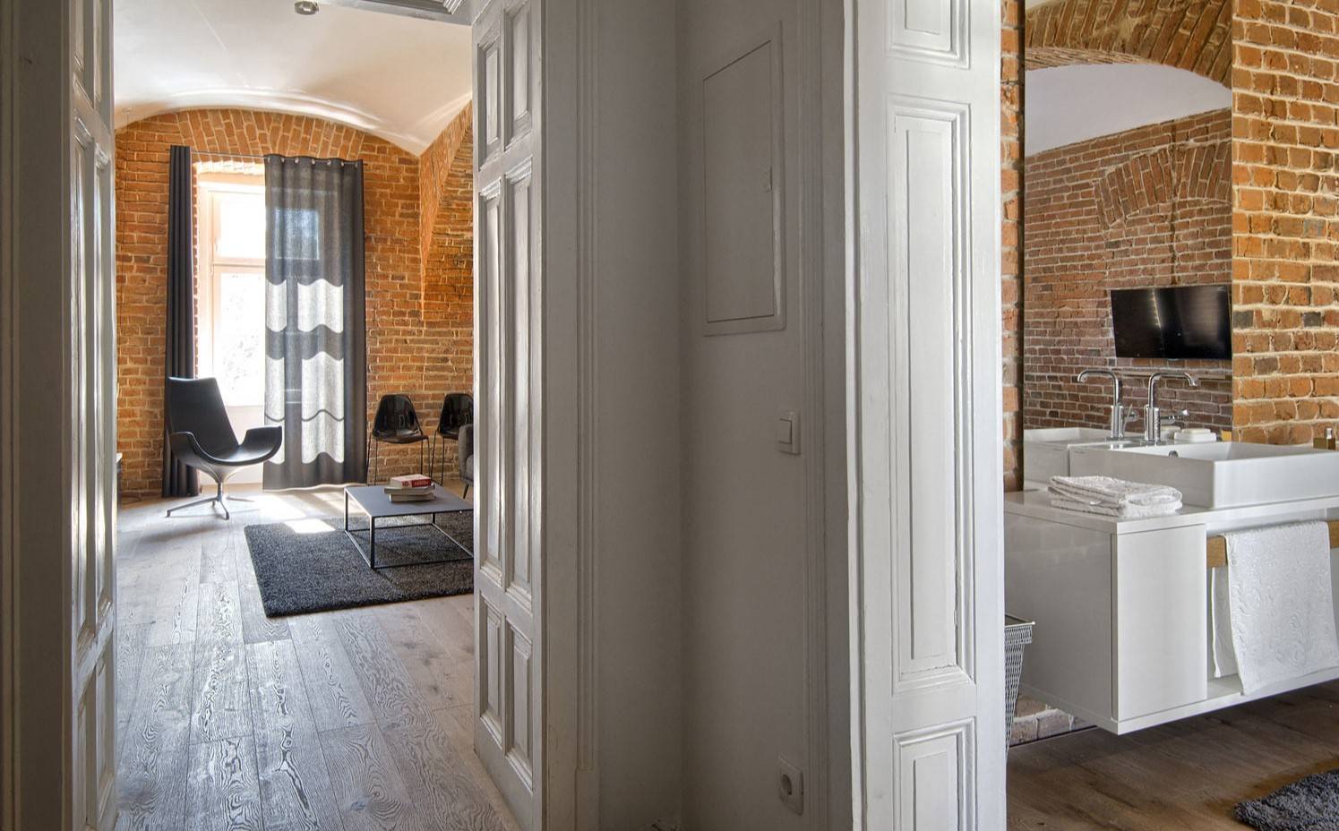 Другой стиль создаст узкая серая полка из состаренного дерева, привезённая с дачи. Настенные светильники в виде уличных фонарей из прихожей родителей будут прекрасно смотреться рядом.