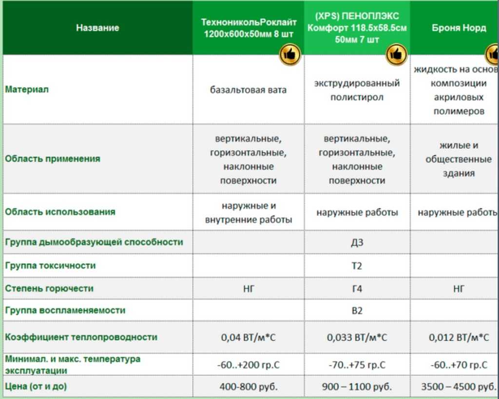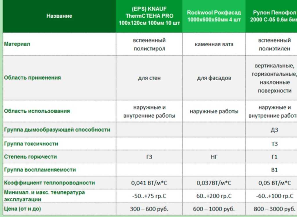 В приведенных ниже таблицах вы можете сравнить виды теплоизоляционных материалов: