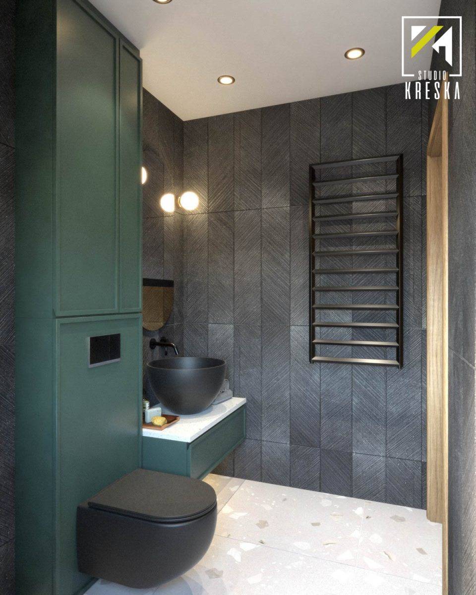 Соединение зон унитаза и умывальника — это темно-зеленые фасады шкафчиков: под умывальником и над унитазом. Это сказывается не только на визуальном восприятии интерьера, но и на большем количестве места для хранения вещей. Закрытые шкафы значительно упрощают поддержание порядка.
