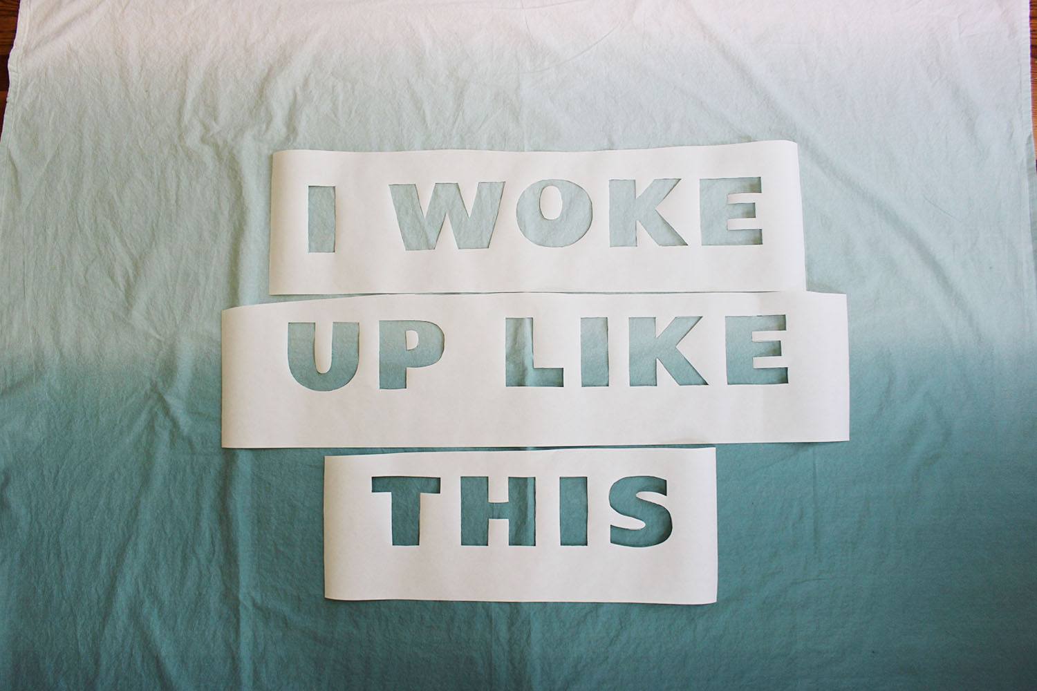 Для начала подберем необходимую фразу для шторки. Печатаем каждую букву отдельно на листах формата А4. Расстилаем шторку и кладем поверх нее листы с буквами в несколько рядов.
