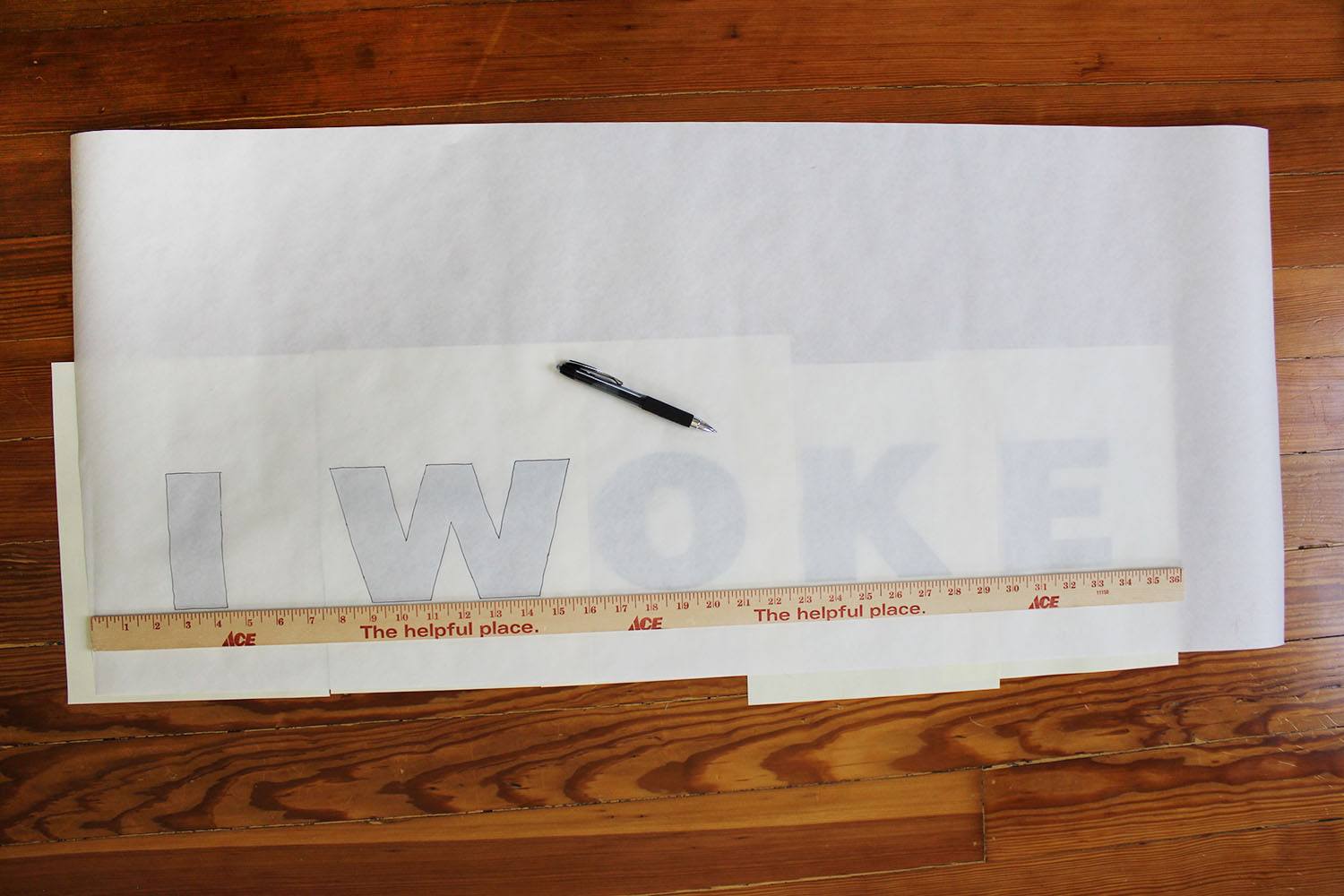 Перекладываем одну строчку фразы на рабочую поверхность. Замеряем размер букв с учетом нескольких сантиметров с каждого края. Отрезаем кусок пергамента и кладем поверх первой строчки фразы. Обводим буквы с помощью ручки или карандаша. Повторяем то же самое с остальными строчками.