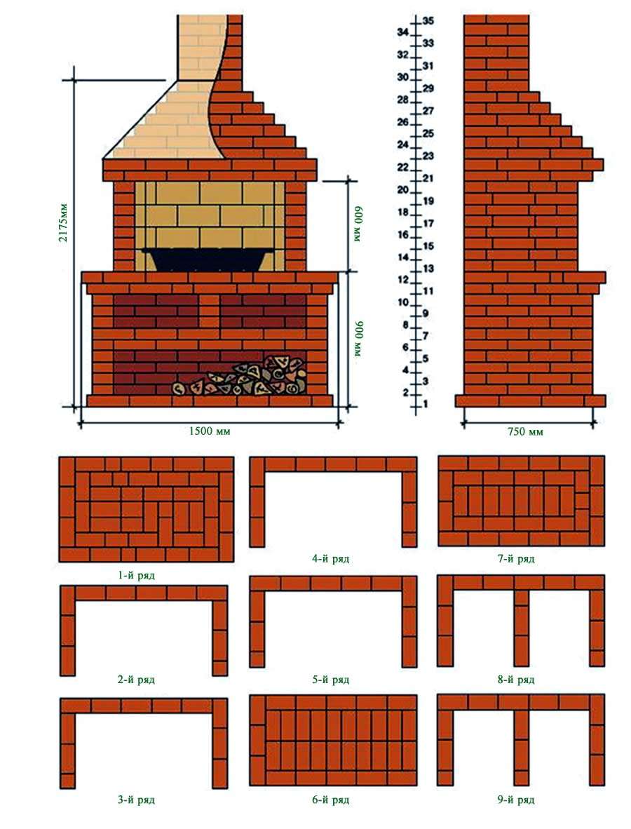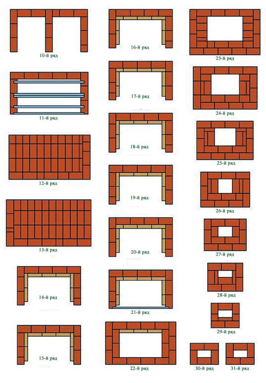 В строительстве конструкции используется схема порядовки (см. ниже). В ней учтены обычные размеры кирпича – 230*114*65. Для топки и печи укладка кирпича должна вестись только на глиняный раствор, а в местах, не контактирующих напрямую с огнем, разрешен к применению обычный.
