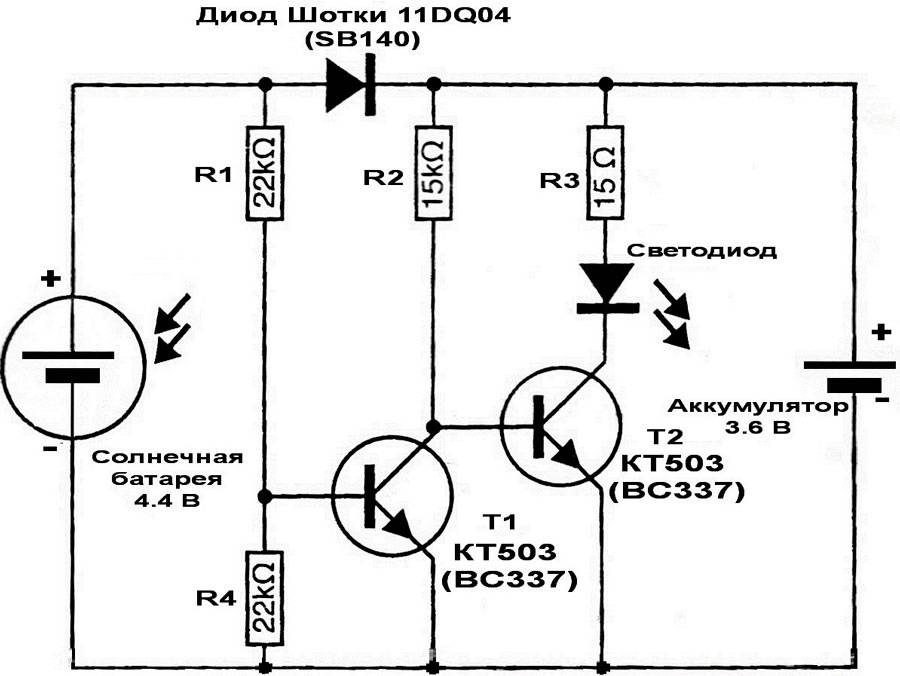 Так как транзистор Т1 открыт, то на базе транзистора Т2 держится нулевой потенциал, и этот транзистор закрыт. Когда наступает темнота, солнечная батарея прекращает вырабатывать электричество, транзистор Т1 закрывается, на базу транзистора Т2 через резистор R2 поступает ток, открывающий его. Тем самым создается цепь питания светодиода. При этом диод Шоттки предотвращает разряд аккумулятора на солнечную батарею.